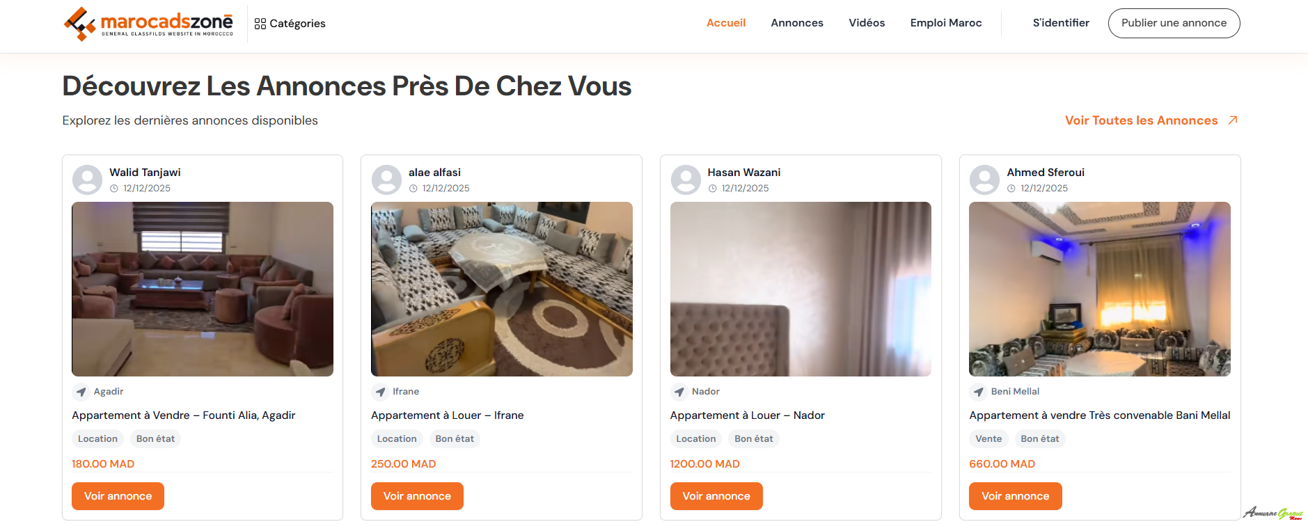 MarocAdsZone est un site de petites annonces gratuites au Maroc conçu pour faciliter la mise en relation entre particuliers et professionnels. La plateforme permet de publier une annonce gratuite rapidement, avec une diffusion ciblée et une navigation intuitive. Sécurisée et moderne, elle offre une visibilité optimale pour promouvoir produits, services et opportunités sur l’ensemble du territoire marocain, tout en garantissant une expérience utilisateur fluide et efficace.